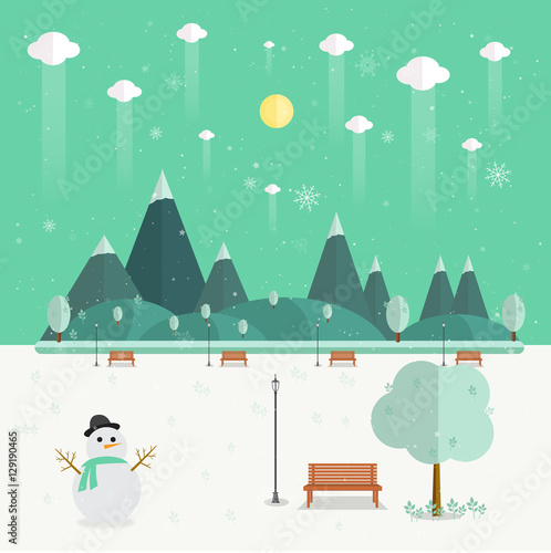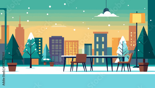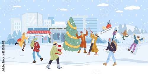 Vektorová sada lidí bruslení, lyžování a odpočinek v kavárně na hoře. Zimní Panoráma města, Horská krajina a kavárna na pozadí horských vrcholů. Aktivní zimní lidé koncept plakáty v plochém stylu