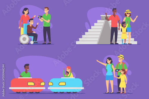 Vektorová sada plakátů starých lidí. Dědeček, invalidní vozík, schodišťový výtah a nákupy plochých designových prvků.