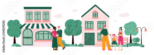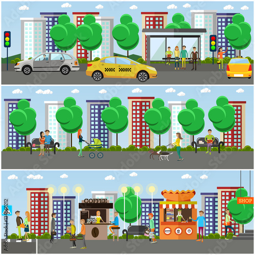 Vektorová sada plakátů, bannerů. Zábavní park s ruským kolem, atrakce střelnice, stánky s jídlem, vozík a lidé, kteří mají odpočinkové designové prvky v plochém stylu.