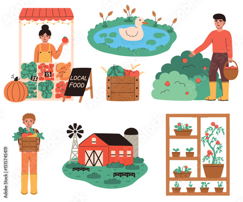Vektorová sada prvků designu zábavního parku, ikony v plochém stylu. Děti s rodiči, odpočívají, kupují cukrovou vatu, zmrzlinu a párek v rohlíku. Street food truck, stánek, kiosek. Střelnice.