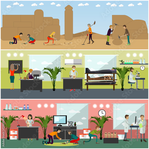 Vektorová sada konceptových plakátů archeologů, bannery. Vědci, archeologové zabývající se výzkumem, laboratorní interiér a vybavení, Archeologické vykopávky. Ploché designové prvky.