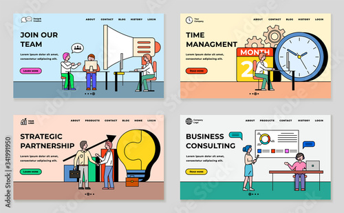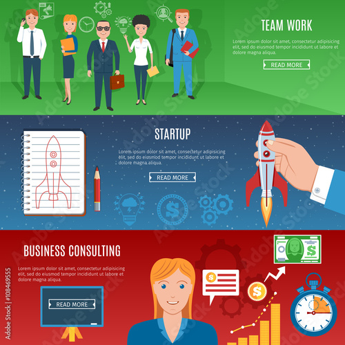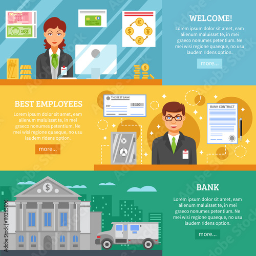 Vektorová sada horizontálních bannerů bankovního konceptu. Pokladna a Čekárna, spolehlivá ochrana a bezpečné, Samoobslužné konstrukční prvky v plochém stylu.