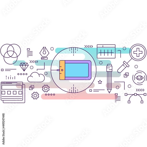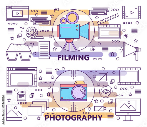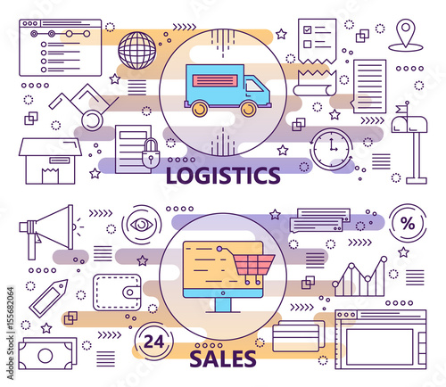 Vektorová sada bannerů s grafickým designem a grafickými nástroji koncepční šablony. Moderní tenké linie ploché designové prvky, symboly, ikony pro nabídku webových stránek.