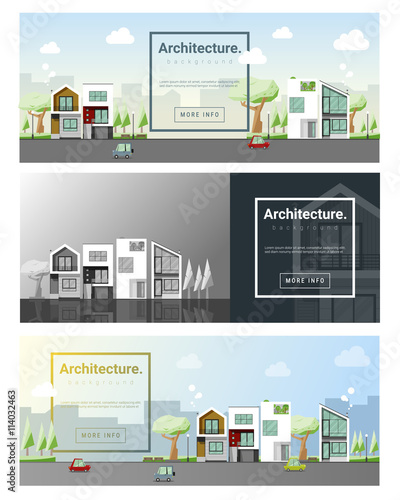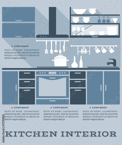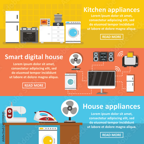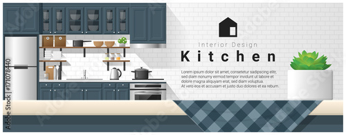 Vektorová sada horizontálních bannerů s kuchyňským interiérem, doplňky a nábytkem, místo pro text, plochý styl.