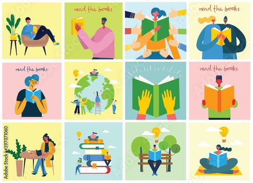 Chlapci a dívky hrají elektrickou kytaru a klavír na jevišti. Mladý muž hraje na akustickou kytaru u táboráku. Vektorová sada bannerů s mladými hudebníky, plochý styl