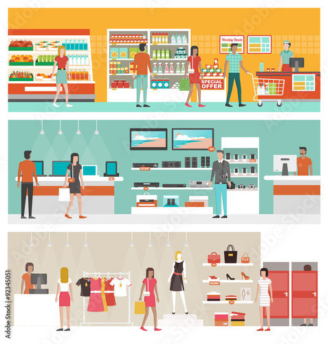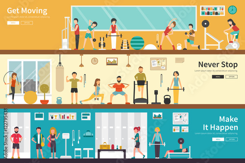 Vektorová sada bannerů s interiéry restaurací. Lidé na obědě v kavárně. Kuchyně, jídelna a kavárna.
