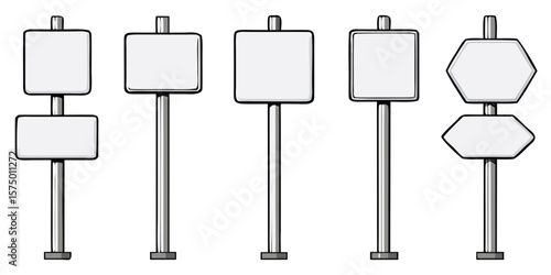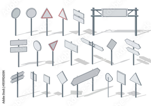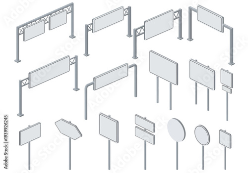 Vektorová sada prázdných Billboard 3D modelů izolovaných na bílém pozadí. Venkovní reklamní billboard ilustrace. Maketa a šablona pro pouliční reklamní kampaň. Reklamní stojan.