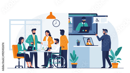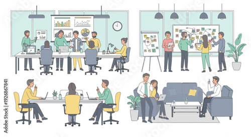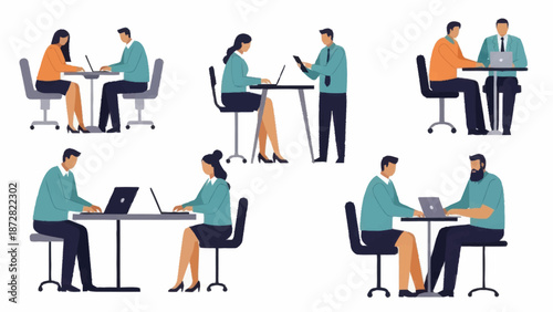 Vektorová sada postav kancelářských lidí v různých druzích obchodních situací, jejich konstrukční prvky pracovišť, ikony izolované na bílém pozadí. Plochý styl ilustrace.