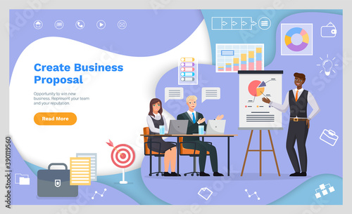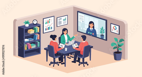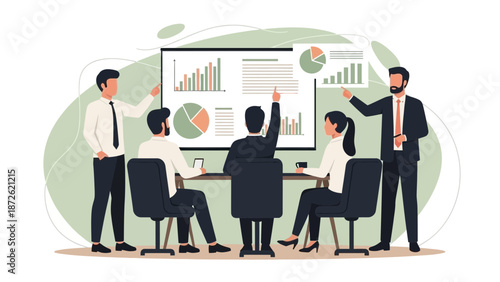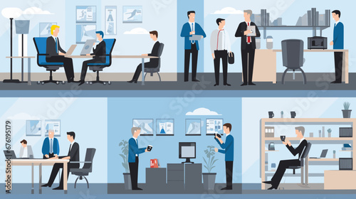 Vektorová sada bannerů obchodních prezentací a schůzek. Plochý design podnikatelů nebo kancelářských pracovníků. Interiér kanceláře.