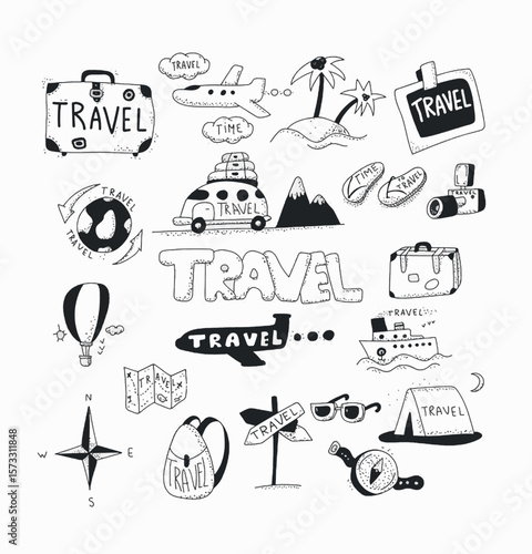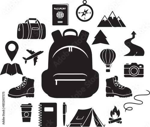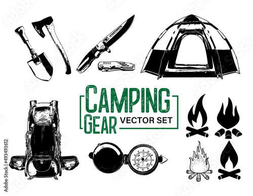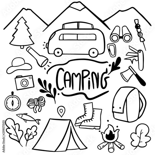 Vektorové sada kempování objektů izolovaných na bílém pozadí. Cestovní ikony a emblémy. Dobrodružství venkovní štítky, hory, stan, auto, rafting, oheň.