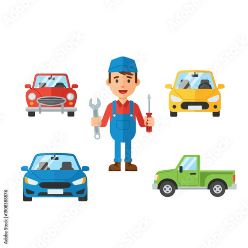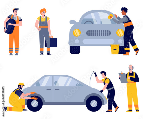 Vektorová sada autoservisu, ikony pracovníků autoservisu izolované na bílém pozadí. Ploché designové prvky.