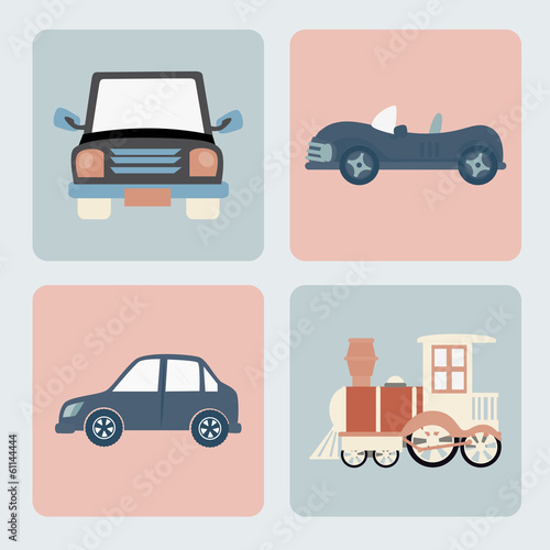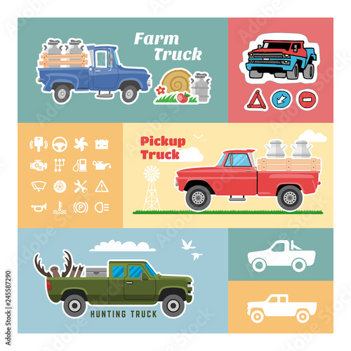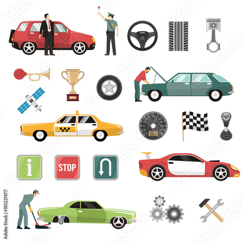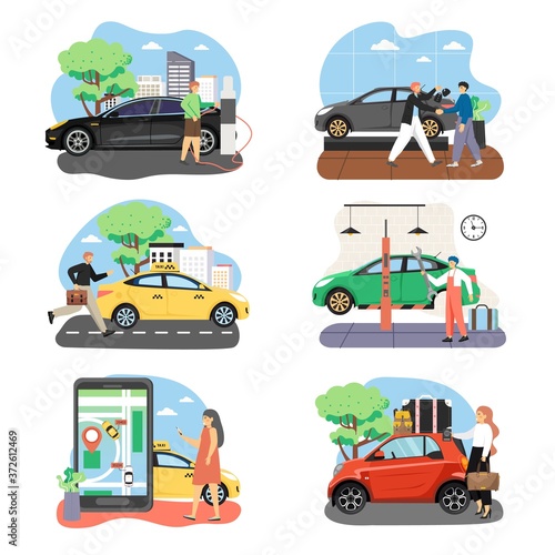 Vektorová sada autoservisu, plakáty s konceptem autoservisu, bannery v plochém stylu. Pracovníci opravují a mění náhradní díly, pneumatiky. Interiér čerpací stanice nebo opravny.