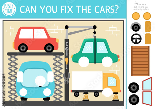 Vektorová sada autoservisů, plakáty opravny, bannery. Automatická kontrola, pneumatika, Výměna kola a koncepce opravy motoru ploché konstrukční prvky.