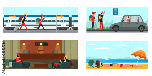 Vektorová sada plakátů v autosalonu. Autosalon, recepce, Prodejce automobilů a testovací jízda ploché designové prvky.