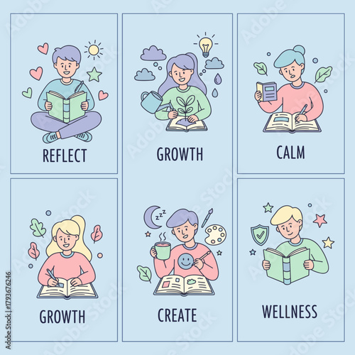 Vektorová sada karet s roztomilými víly a inspirativními citacemi. Krásné holčičky, mýtické bytosti a pohádkové postavy s křídly sedí na květině, čtení knihy, létání atd.