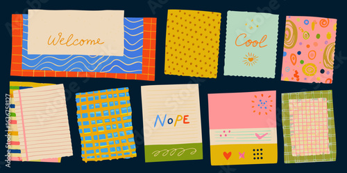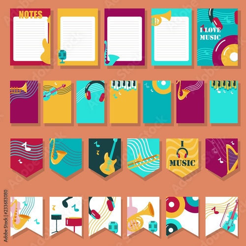 Vektorové sada karet, vlajky party dekorace s hudebními nástroji, noty a doplňky. Hudební leták, pozvánka, šablony poznámkového bloku.