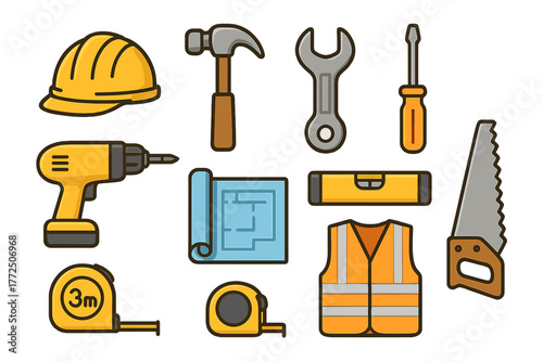 Vektorová sada tesařských nástrojů a nástrojů v plochém stylu. Designové prvky a ikony izolované na bílém pozadí. Domácí stavební opravy nástroje.