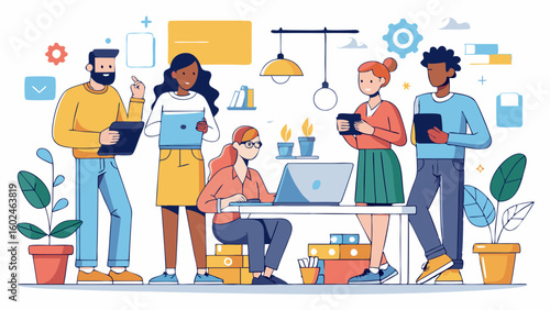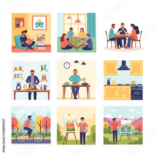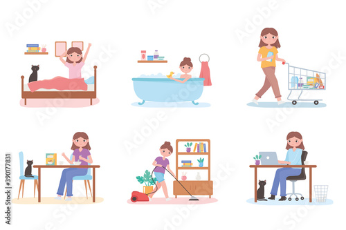 Vektorová sada kreslených postaviček v plochém stylu. Pár v kavárně, žena vaří v kuchyni, chlap pracuje s počítačem, dívka si hraje se psem. Ikony lidí izolované na bílém