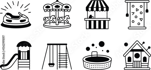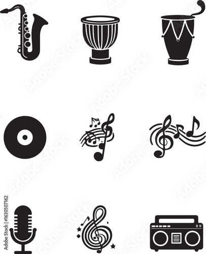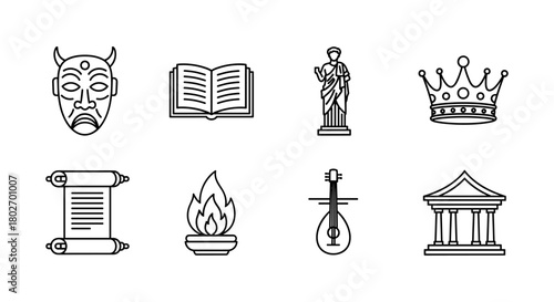 Vektorová sada klasických divadelních izolovaných ikon. Černobílé divadelní symboly a designové prvky. Činoherní masky, Harfa, vstupenky, divadelní závěsy a jevištní závěsy.