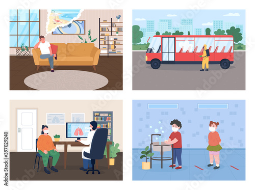 Vektorová sada vysokoškolských plakátů. Společenská místnost, Disco party, jídelna a profesor plochý styl designové prvky.