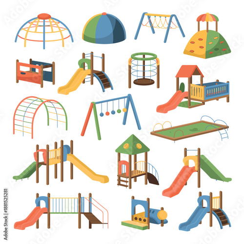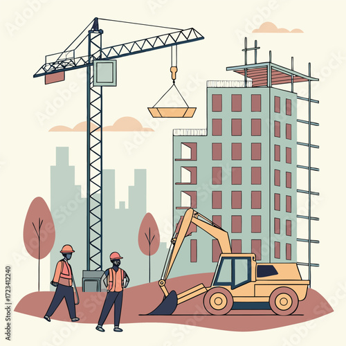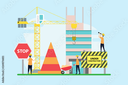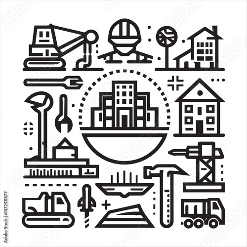 Vektorová sada objektů a nástrojů na staveništi izolovaných na bílém pozadí. Stavební stavební zařízení ikony v plochém stylu. Jeřáb, cihly, cedule, míchačka na beton.
