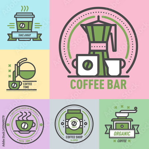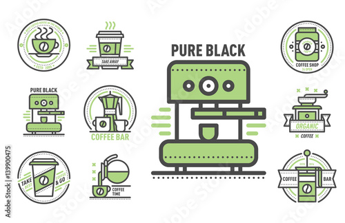 Vektorová sada skvělých robotů. Robot káva, kurýr, model a umělec designové prvky, ikony v plochém stylu. Technologický koncept.