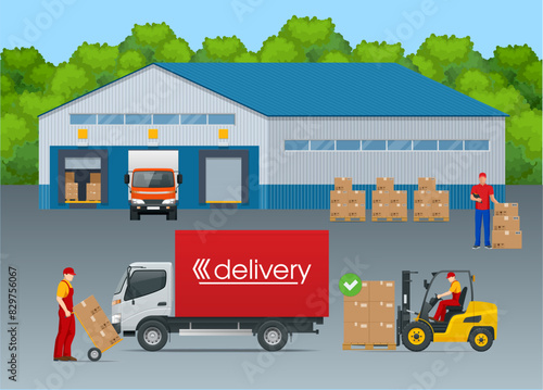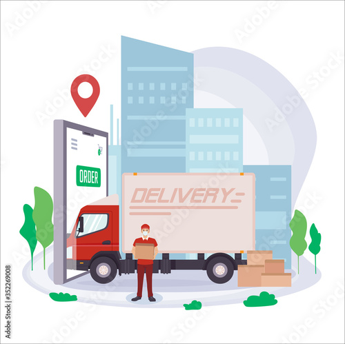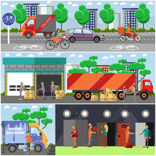 Vektorová sada plakátů kurýrní služby, bannery. Dodávky potravin a zboží na kole, kamion a Motorový skútr. Ploché designové prvky bez lidí.