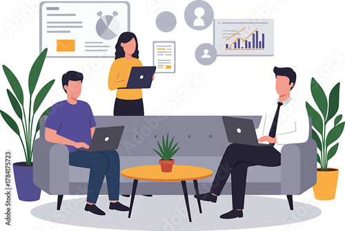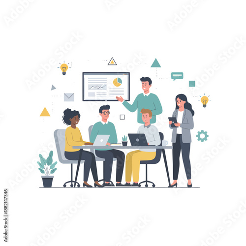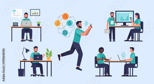 Vektorová ilustrace vývojáře webových stránek, sponzora, programátora nebo správce systému nebo testera na pracovišti. Kreativní tým lidí plochý styl designové prvky, ikony izolované na bílém pozadí.