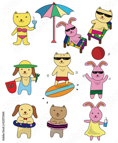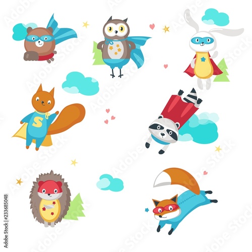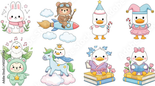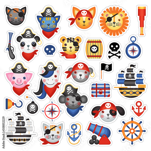 Sada ikon pirátů. Vektorové ilustrace roztomilých zvířat panda, mýval, liška v pirátské klobouky, loď s pirátskými vlajkami, medúzy s náplastí na oči a další mořské předměty izolovaných na bílém pozadí.