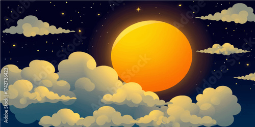 Vektorová sada denních a nočních horizontálních bannerů s nebeskou krajinou. Denní modrá obloha se sluncem a bílými mraky a noční Tmavě modrá obloha s půlměsícem a hvězdami.