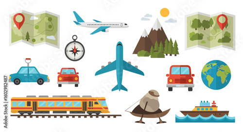 Vektorová sada konstrukčních prvků koncepce dodávkového vozidla v plochém stylu. Dodávka letadlem, lodí, kamionem. Odvoz zboží ze skladu vysokozdvižným vozíkem. Logistická doprava.