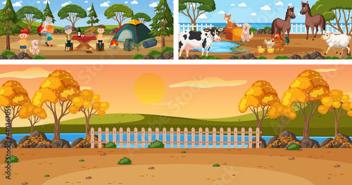 Vektorová sada plakátů delfinária, cirkusu a zoo, bannery. Zvířata v Zoo, trénovaná cirkusová a delfináriová zvířata. Vzdušní akrobati a klauni vystupující na jevišti. Ploché designové prvky.