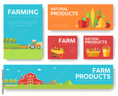 Vektorová sada horizontálních bannerů farmy. Zemědělství na farmě, sklizeň pšenice. Výroba mouky a zvířat na farmě plochého stylu konstrukčních prvků.
