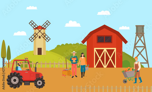 Vektorová sada zemědělských konceptů plakátů, bannerů. Lidé pracující na včelín a farmy, sklizeň pšenice na poli. Pracovníci a zemědělské stroje, ploché konstrukční prvky.