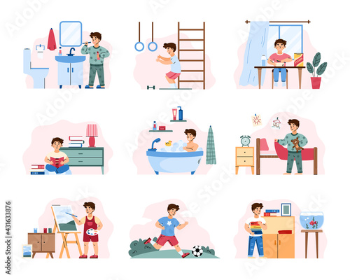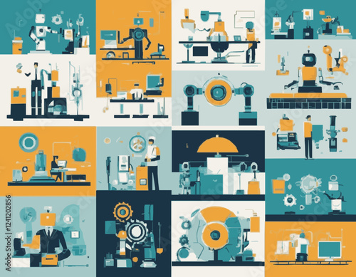 Vektorová sada plochých plakátů rychlého občerstvení, bannery s rychlým servisem restaurace nebo kavárny, profesionální personál a návštěvníci. Lidé, kteří dělají online objednávku z domova, kurýr s červenou dodací taškou.