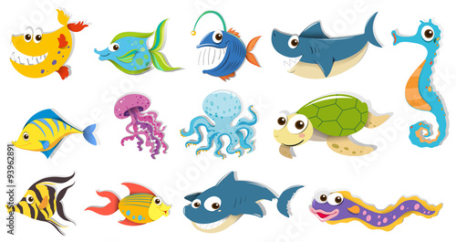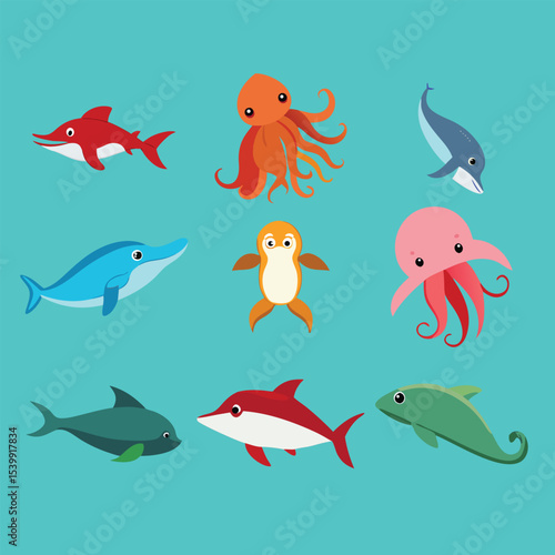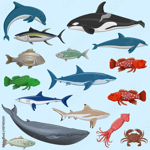 Vektorová sada jasných barevných rybích ikon izolovaných na bílém pozadí. Ploché designové prvky.