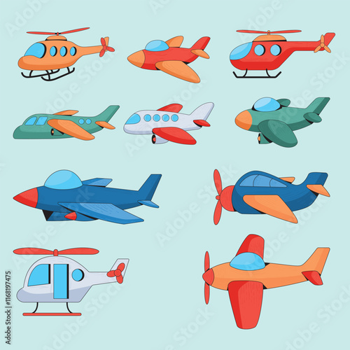 Vektorová sada létajícího balónu, vrtulníku, letadla a retro dvojplošníku s reklamními bannery. Šablona pro text. Designové prvky v plochém stylu.