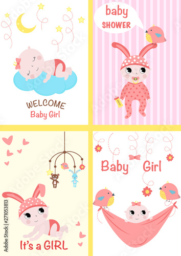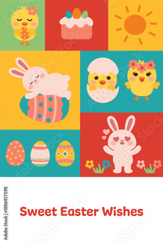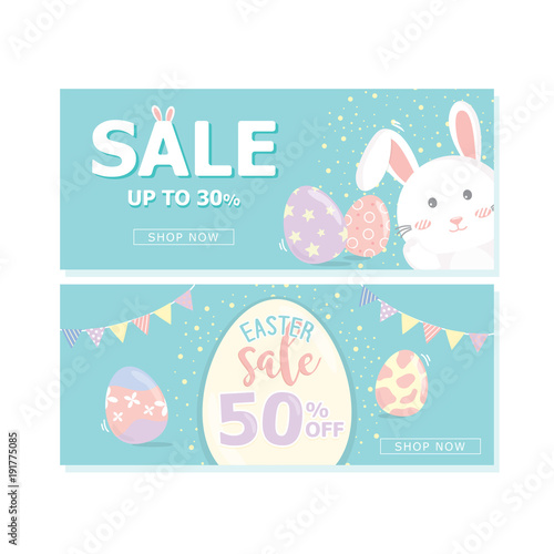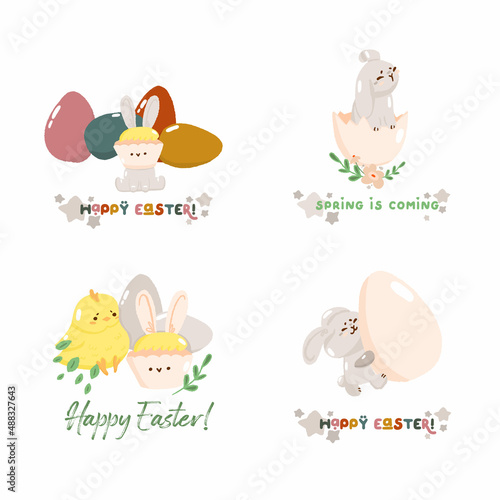 Vektorová sada pohlednic s velikonočními králíky, velikonočními vejci, květinami a veselým velikonočním písmem. Jarní prázdniny oslava plakát design šablony.