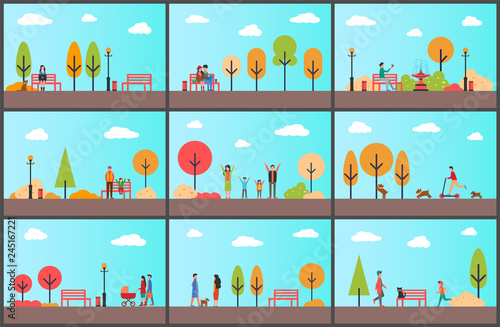 Vektorová sada plakátů v tělocvičně, bannery s lidmi, kteří trénují v parku a ve fitness klubu. Dívky dělají step aerobik, cvičení s švihadly, činky, hula obruče, jogging. Plochý design.