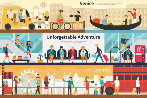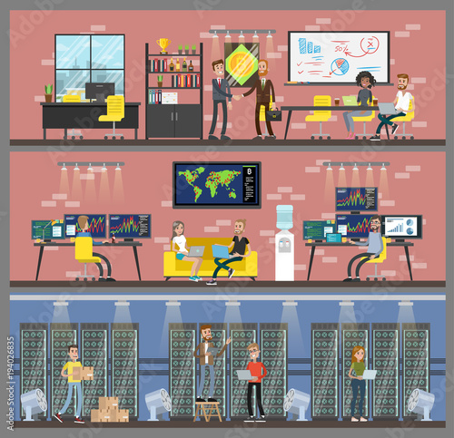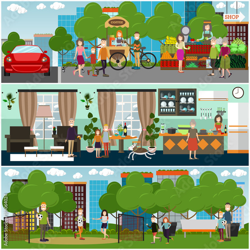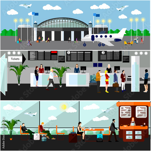 Vektorová sada plakátů v tělocvičně, bannery s fitness lidmi muži a ženy dělají cvičení s činkou, činky, pomocí nožního lisu, běžeckého pásu. Vybavení tělocvičny koncept plochý styl designu.