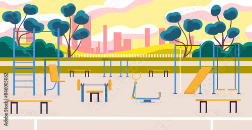 Vektorová sada interiérových plakátů, bannerů. Fitness klub nebo centrum s cvičebním vybavením, sociální park místo pro venkovní cvičení. Plochý design.