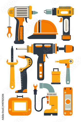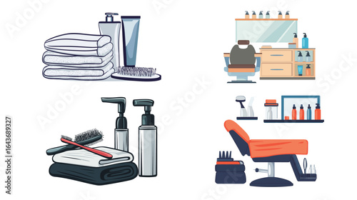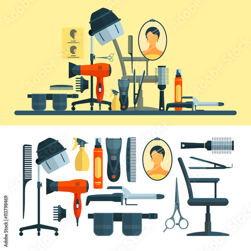 Vektorová sada kadeřnických objektů a nástrojů izolovaných na bílém pozadí. Ikony vybavení kadeřnictví, vysoušeč vlasů, Vysoušeč vlasů, hřeben, nůžky.