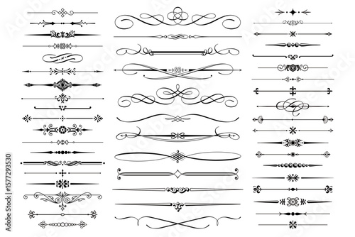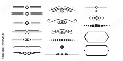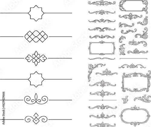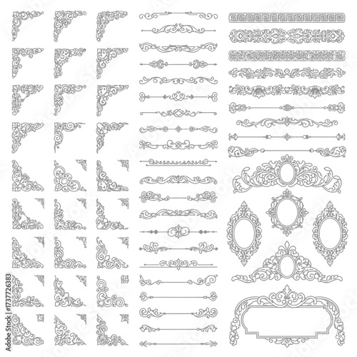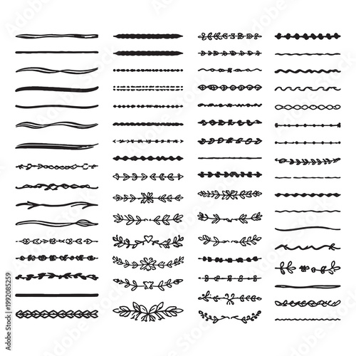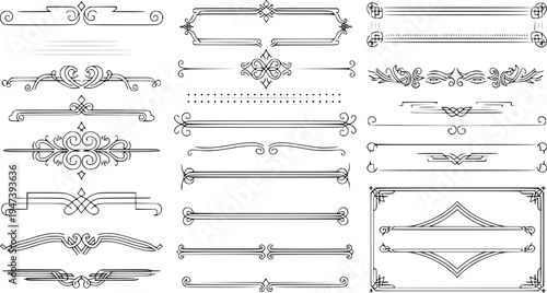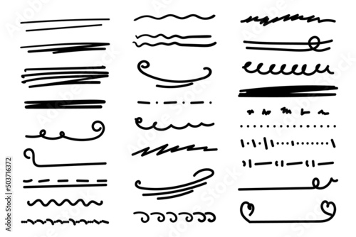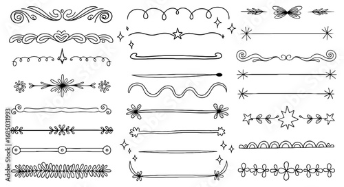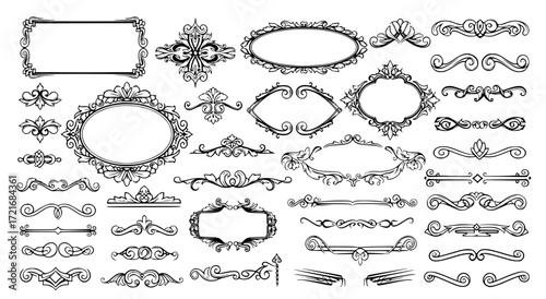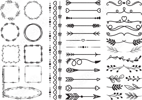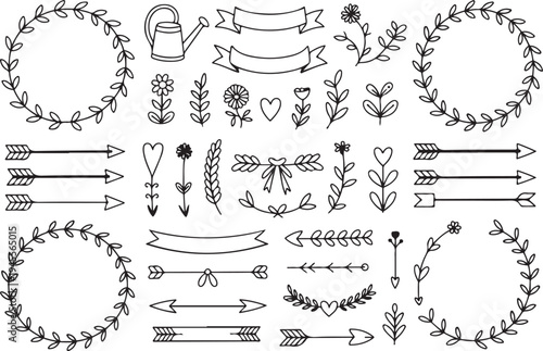 Vektorové sada doodle dekorativních symbolů. Šipka, věnec, banner, hranice, rám, květinové prvky. Ručně kreslené ilustrace izolovaných na bílém pozadí.