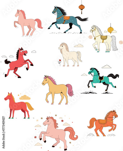 Vektorová sada ikon jezdců. Jízda na koni, kovboj s lasem, kůň na zadních nohách, jezdecký sportovec, amatérský jezdec,Jezdectví, jízda na koni. Plochý design