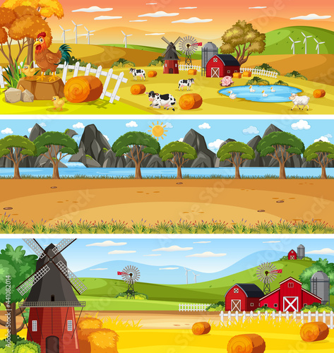 Vektorová sada jízdy na koni, zkrocení koní a zemědělské koncepční bannery, plakáty, plochý styl.