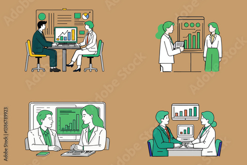 Vektorová sada plakátů hotelového náměstí. Úklid, recepce, služebná, Porter plochý styl designové prvky.