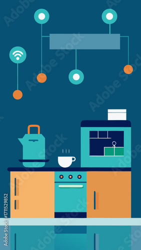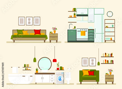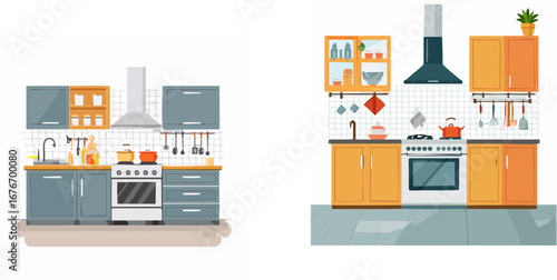 Vektorová sada kuchyňských interiérových plakátů, bannery s kuchyňskými spotřebiči, lednice, sporák, myčka nádobí. Domácí interiér, ilustrace v plochém stylu