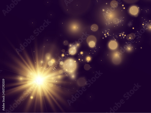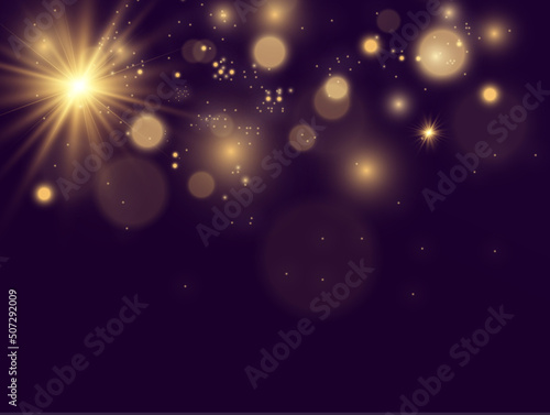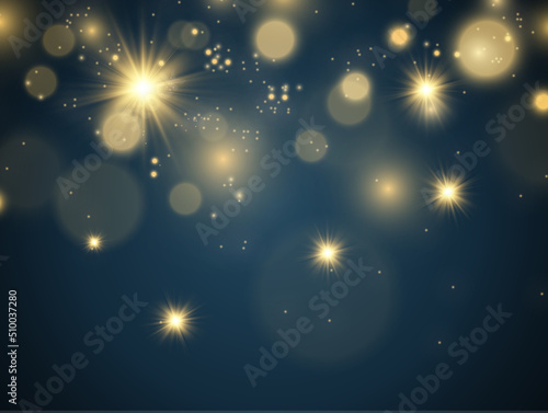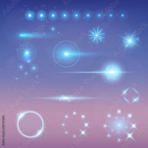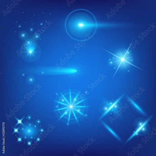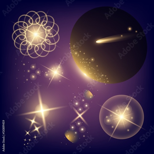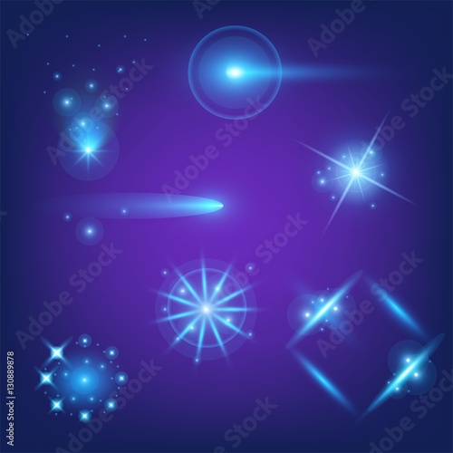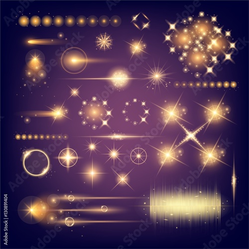Vektorová sada světelných efektů. Izolované objekty šablony klipartů. Záře světla hvězdy praskne s jiskry. Kouzelné třpytivé efekty