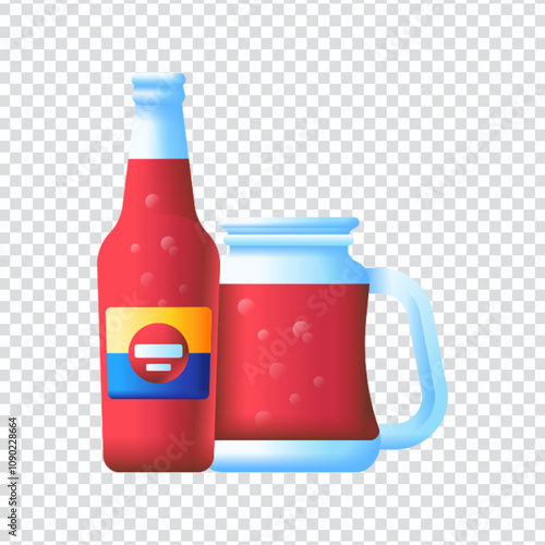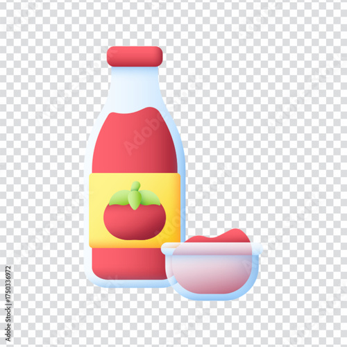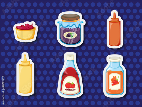 Vektorová sada různých omáček v keramických miskách, majonéza v plastovém sáčku doypack bag, rajčatový kečup ve skleněné láhvi a hořčice v plastové láhvi. Balení potravinářských výrobků s maketami štítků.