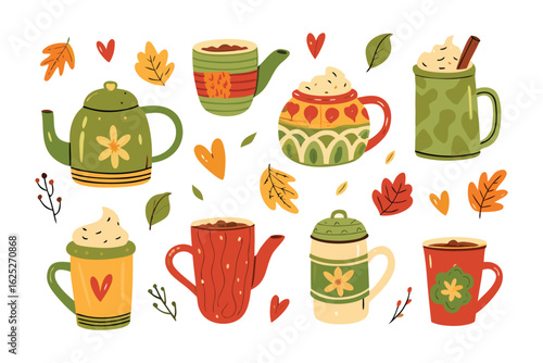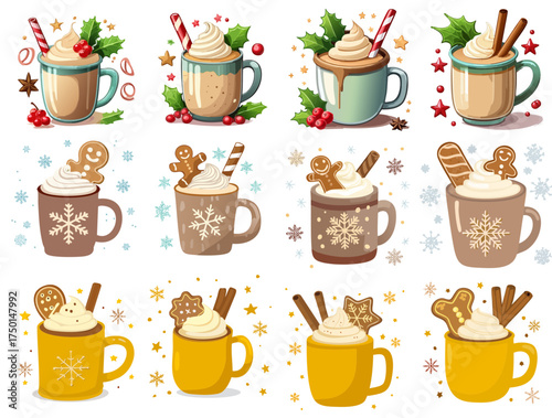 Vektorová sada barevných hrnků s horkým kakaem, marshmallow, symboly zimních prázdnin, izolované na bílém pozadí. Vánoční a novoroční designové prvky pro kavárnu, kavárnu, přání, pozvání.